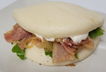 Pan blandito relleno al vapor. Puedes elegir entre solomillo de atún a la plancha, salmón ahumado con queso Philadelphia o Pollo Teriyaki.