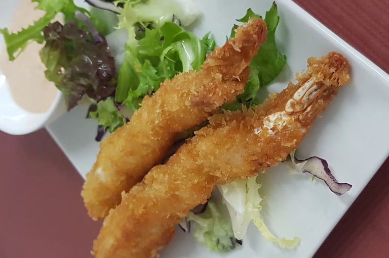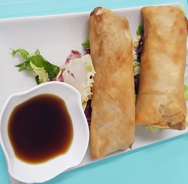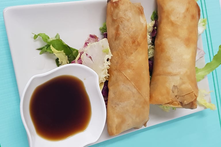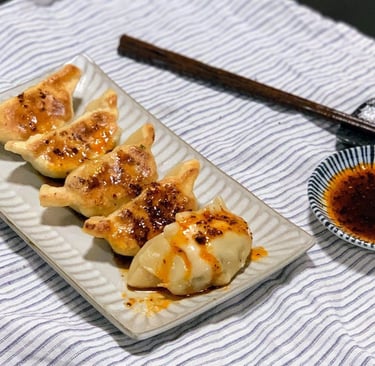 Empanadillas japonesas rellenas. Puedes elegir entre Pollo, Pato, Cerdo, Langostino, Pollo con Curry, Cerdo con Mostaza o Verduras.